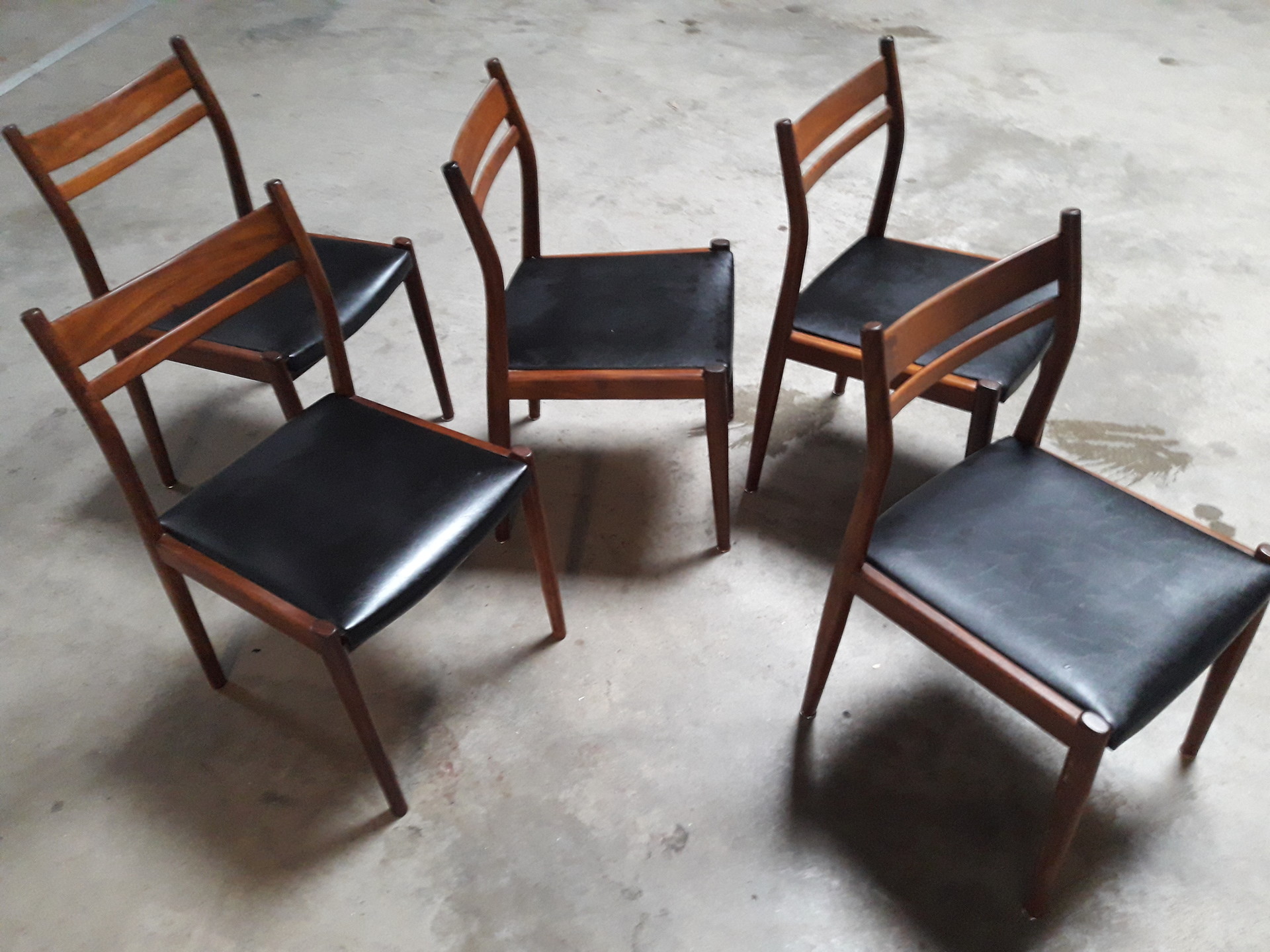 Joli design scandinave pour ces chaises vintage en teck massif et assises en simili cuir noir.